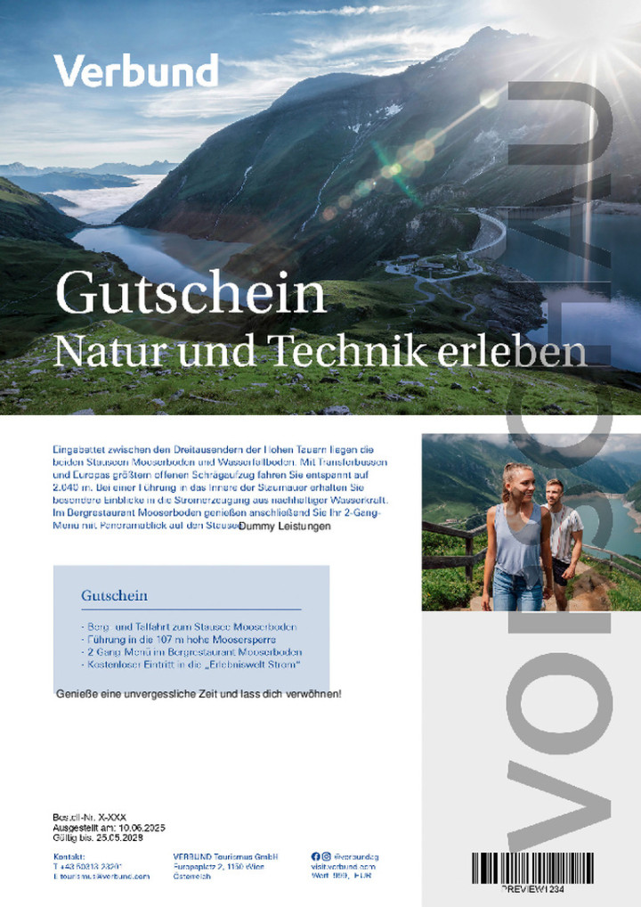 The two reservoirs Mooserboden and Wasserfallboden are nestled between the three thousand metre peaks of the Hohe Tauern. Transfer buses and Europe's largest open inclined lift take you up to 2,040 metres above sea level. A guided tour inside the dam will give you a special insight into how electricity is generated from sustainable hydropower. Afterwards, enjoy your 2-course meal with a panoramic view of the reservoir in the Mooserboden mountain restaurant.